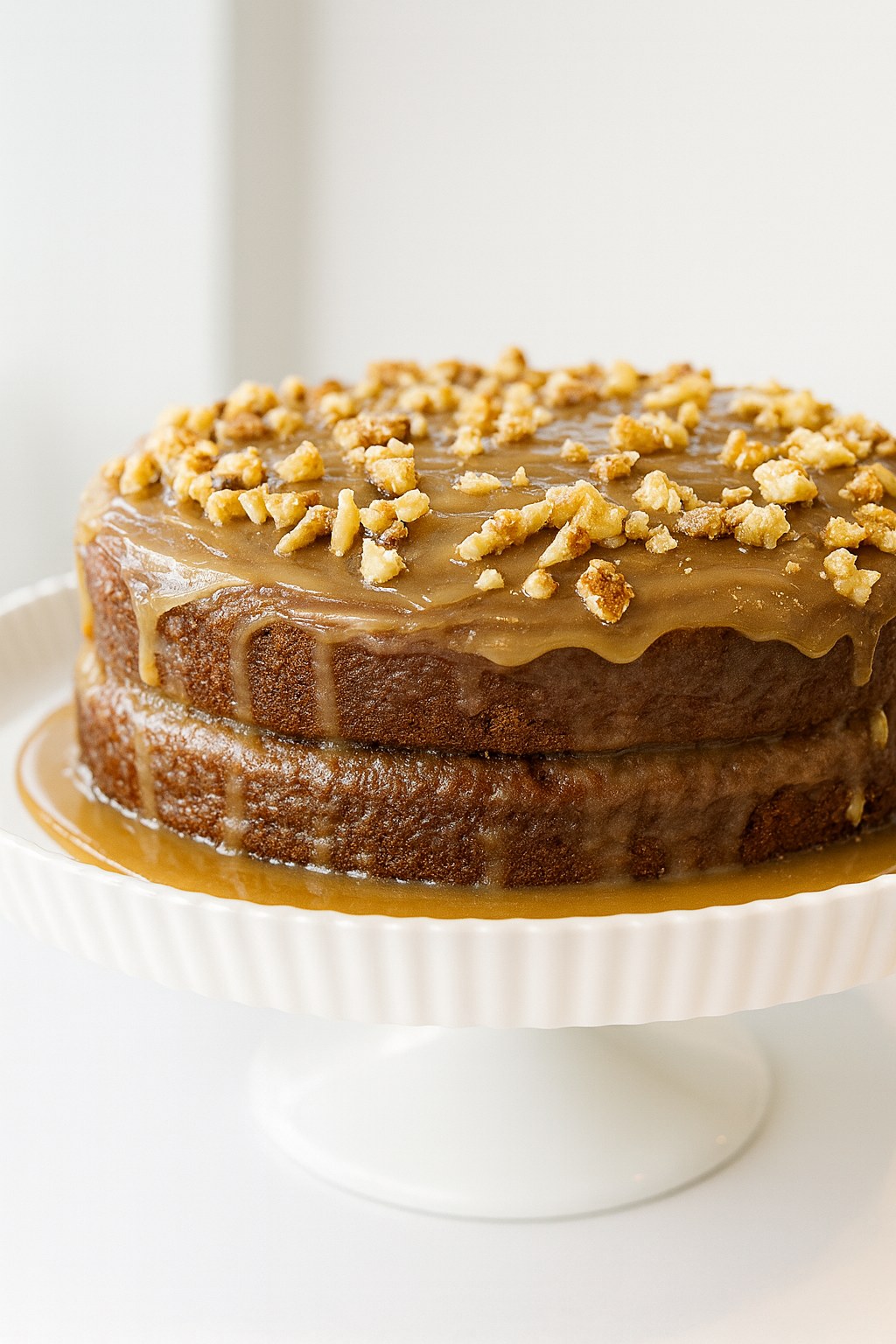 Moist date sponge layered with sticky toffee icing and finished with walnut pieces.